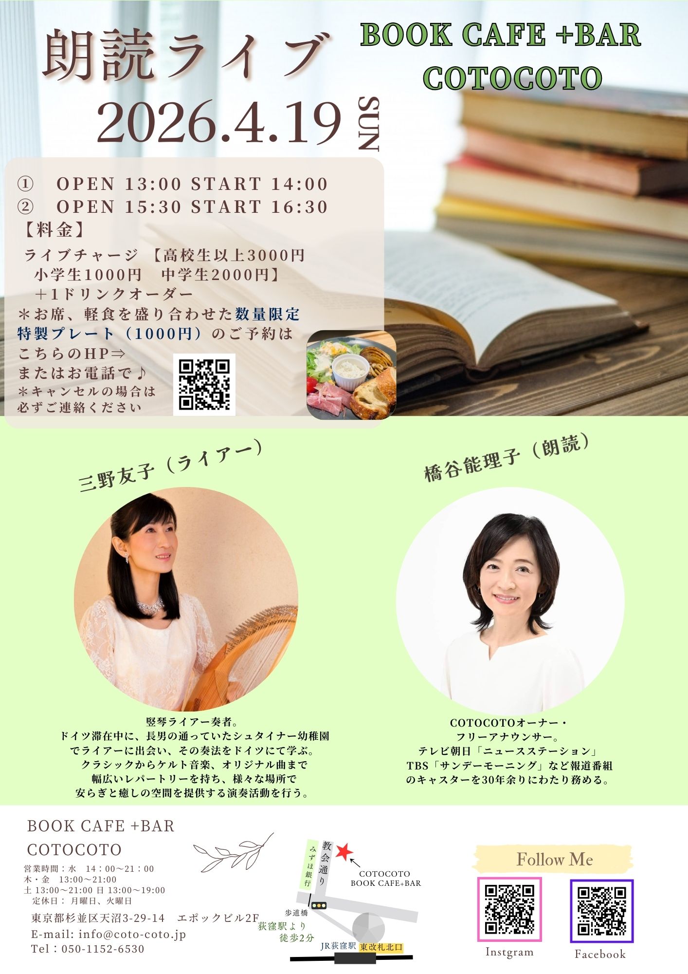 4月19日(日)に荻窪のブックカフェ「COTOCOTO」さんで朗読ライブを開催いたします。COTOCOTOさんでの朗読ライブは昨年の9月に引き続いて、2回目の出演となります。 前回同様にフリーアナウンサーの橋谷能理子さんとご一緒いたします。 橋谷さんは2023年3月まで30年にわたりTBSの「サンデーモーニング」に出演なさっていたので、テレビの画面を通じてご存じの方も多いかと思います。 橋谷さんのお声はやさしくて、本当に素敵なのですよ〜。 その橋谷さんが東京は荻窪にブックカフェ「COTOCOTO(コトコト)」をご友人と運営なさっています。 https://coto-coto.jp/ 朗読ライブは2部制になっていて、14:00開始の部と、16:30開始の部です。いずれも同じ内容となります。 4月19日(日)朗読ライブ @スタート 14:00 オープン 13:00 Aスタート 16:30 オープン 15:30 (プログラムは同じ2部制です。) ♪ライブチャージ: 大人 3000円(各回 定員20名)+ワンオーダー ♪場所:ブックカフェ COTOCOTO https://coto-coto.jp/ お申込み: https://share.google/S6bflD7RC4pBCtiSO もしくは電話でのお申込みも大丈夫です。 050-1152-6530